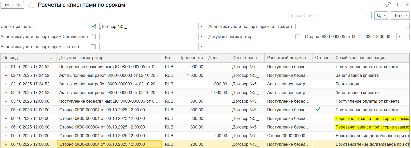 При вводе документов Сторно/Исправление по РН «Расчеты с клиентами по срокам» будут формироваться «честные» движения сторно со знаком «минус» и при необходимости «починочные» движения:
