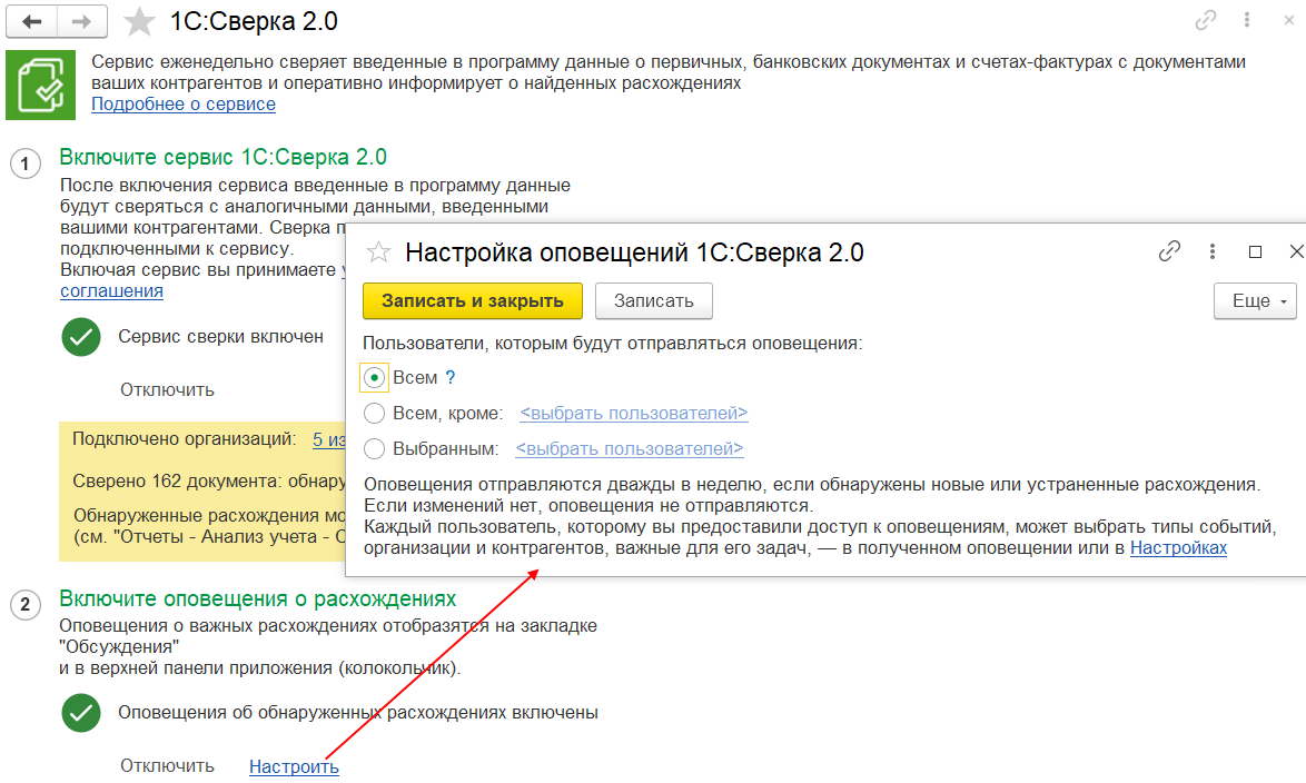 Можно настроить оповещения об обнаруженных расхождениях.