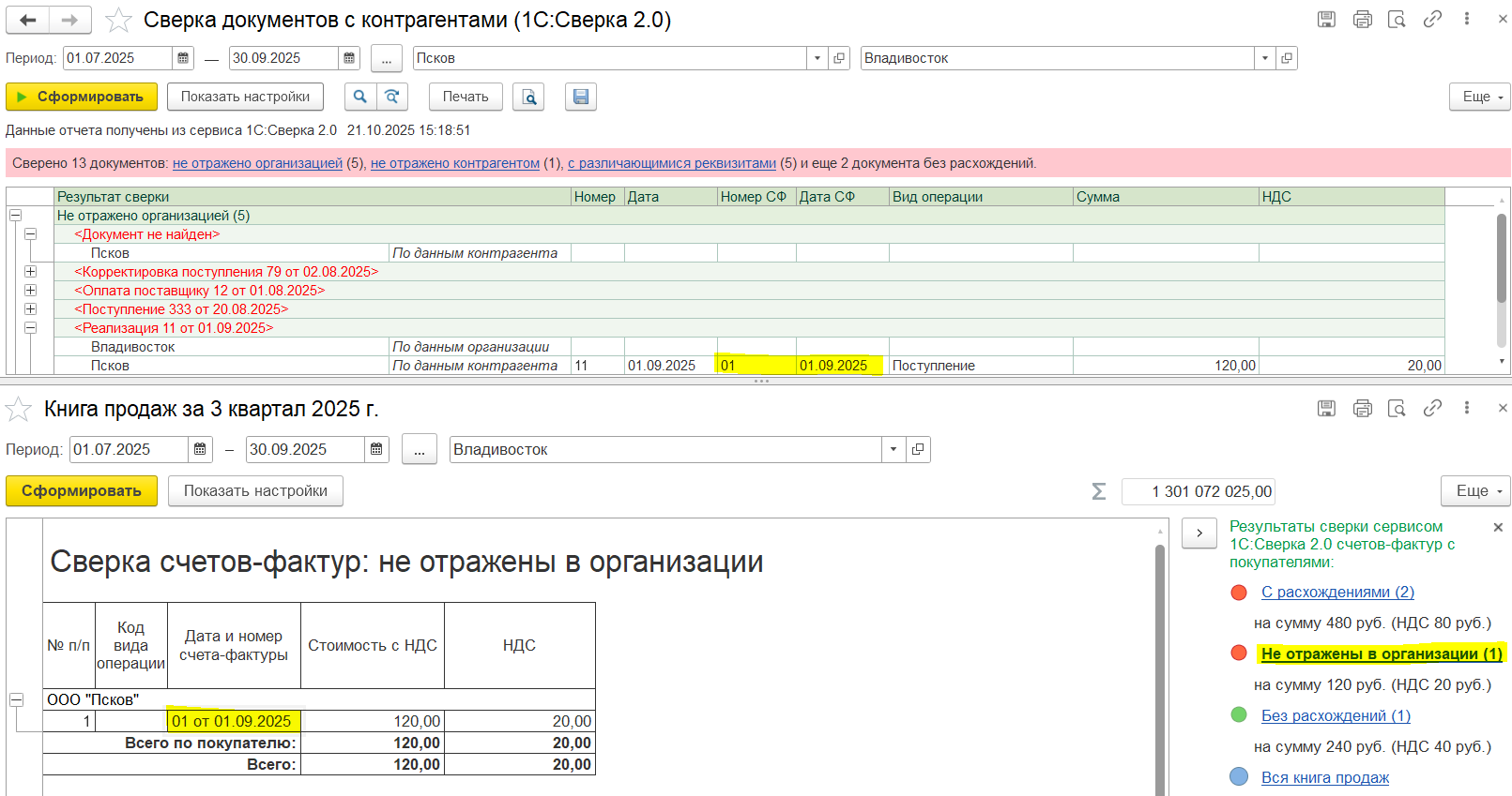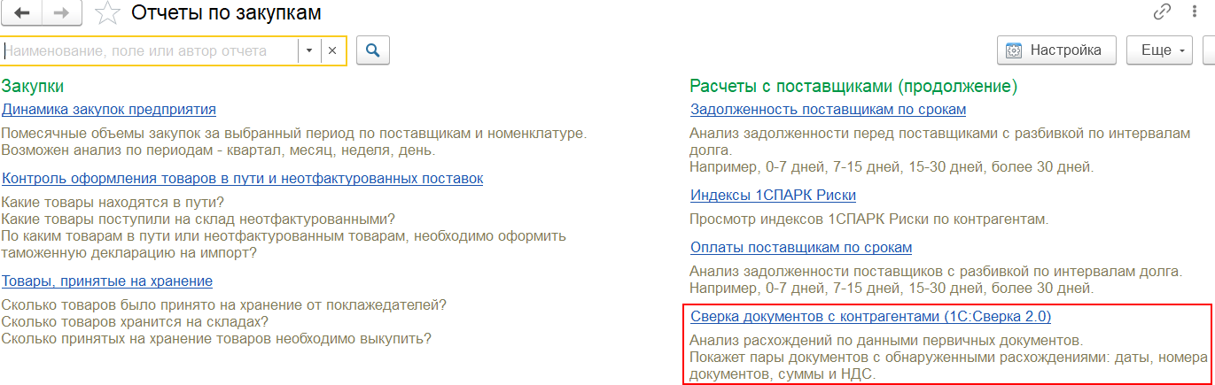 После подключения к сервису становится доступным отчет Сверка документов с контрагентами (1С:Сверка 2.0) по ссылкам: