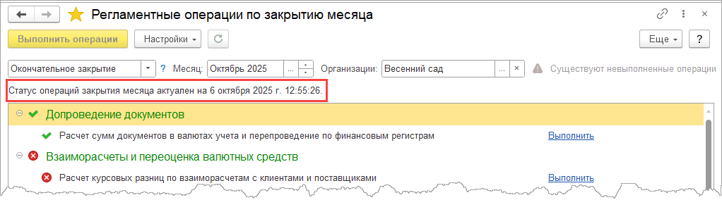 Окончательный пересчет остатков выполняется в базе СИ, и может занять около одной минуты.