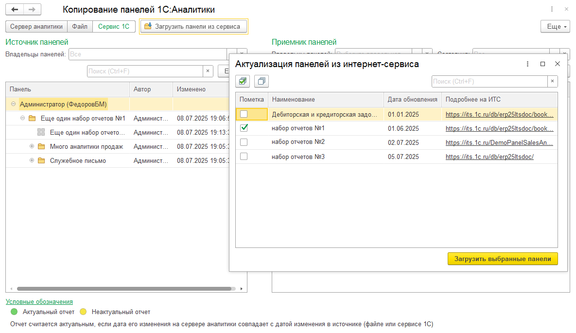 В основной части формы копирования панелей слева отображаются список панелей отчетов в источнике, справа – в приемнике. Для приемника предусмотрено отображается состояние актуальности элемента пиктограммой – кружком зеленого (актуальный отчет) или желтого (не актуальный отчет) цвета, а также быстрый отбор по состоянию над таблицей.