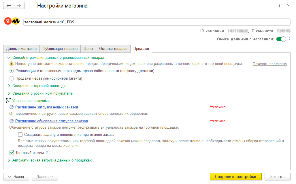 Для работы с заказами предусмотрен тестовый режим (интеграция с тестовой средой Яндекс Маркета).