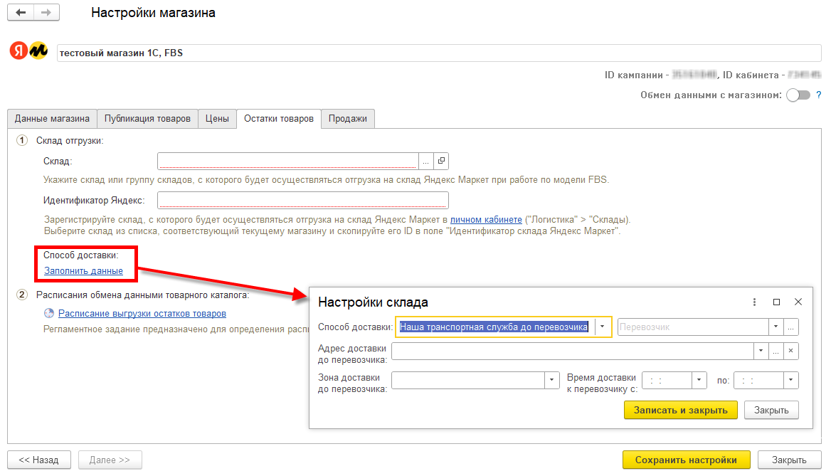 На странице настроек обмена данными Остатки товаров для модели FBS настраивается способ доставки. Эта информация необходима для заполнения данных о доставке при создании заказов.