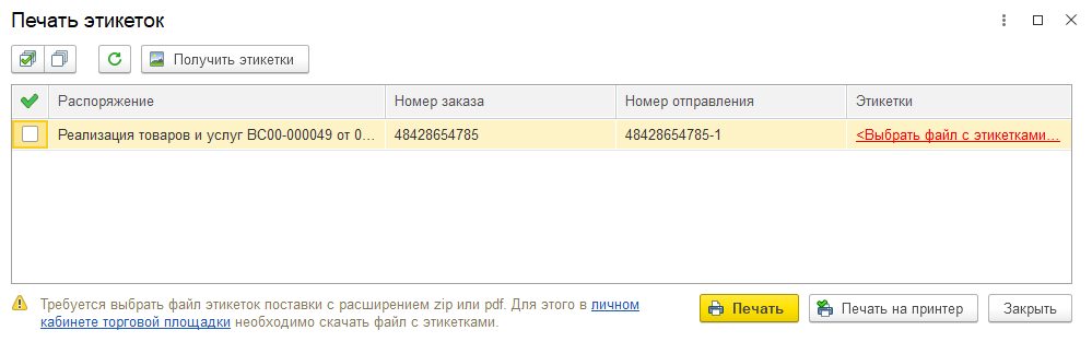 Для печати необходимо сначала Получить этикетки соответствующей командой. Полученные этикетки далее можно распечатать.