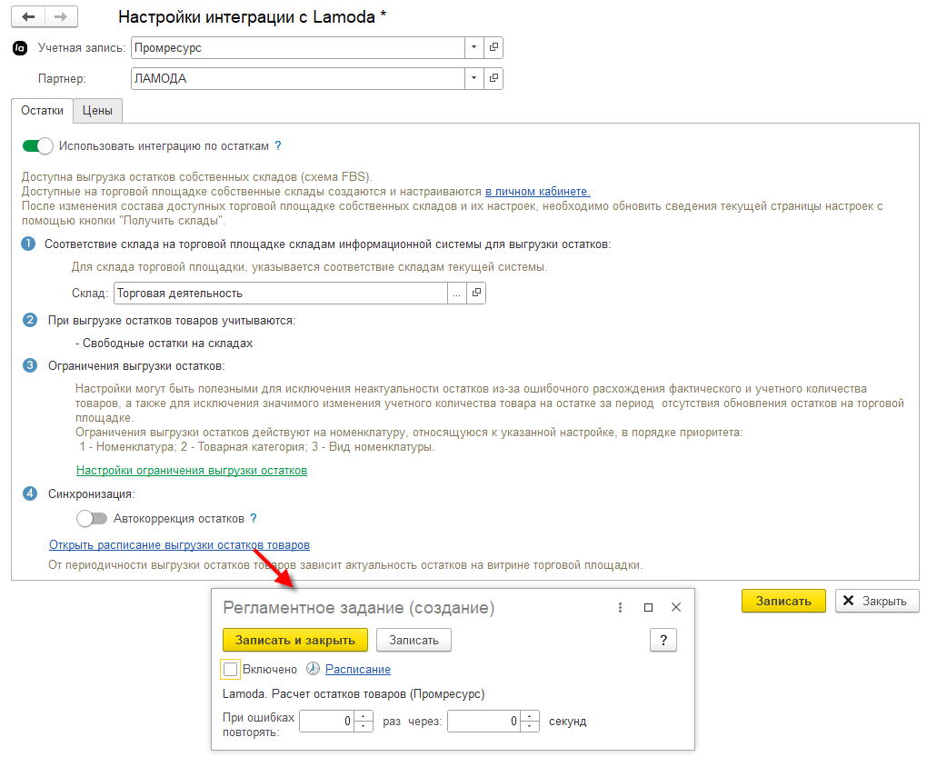 На закладке Цены необходимо включить интеграцию по ценам, указать соответствие видов цен 1С ценам торговой площадки и задать параметры синхронизации по ценам.