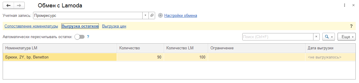 В списке отображается текущий остаток по складу торговой площадки по данным информационной базы (Количество) и торговой площадки (Количество LM) соответственно. Также показывается, какое ограничение было применено к выгружаемому количеству.