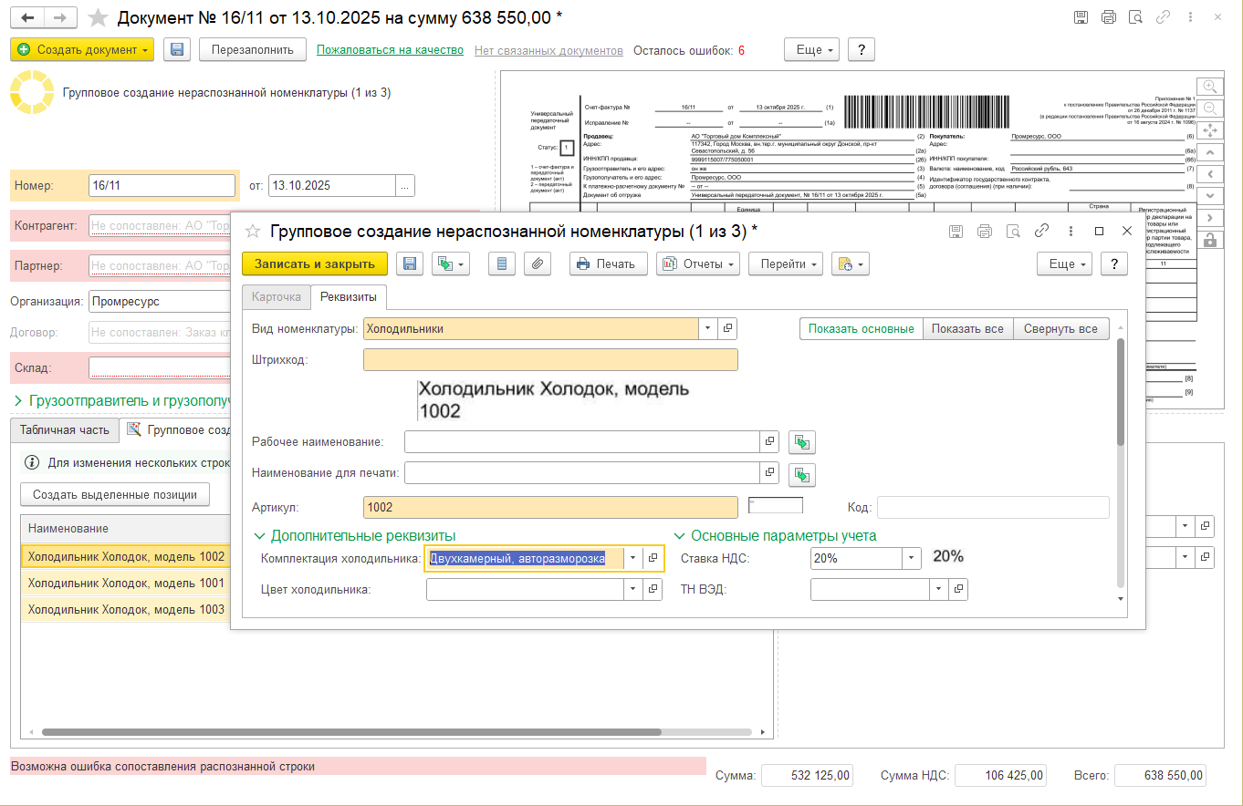 Создать все отсутствующие в информационной базе карточки номенклатуры по указанным в документе позициям можно на закладке Групповое создание нераспознанной номенклатуры в нижней части формы распознанного документа.