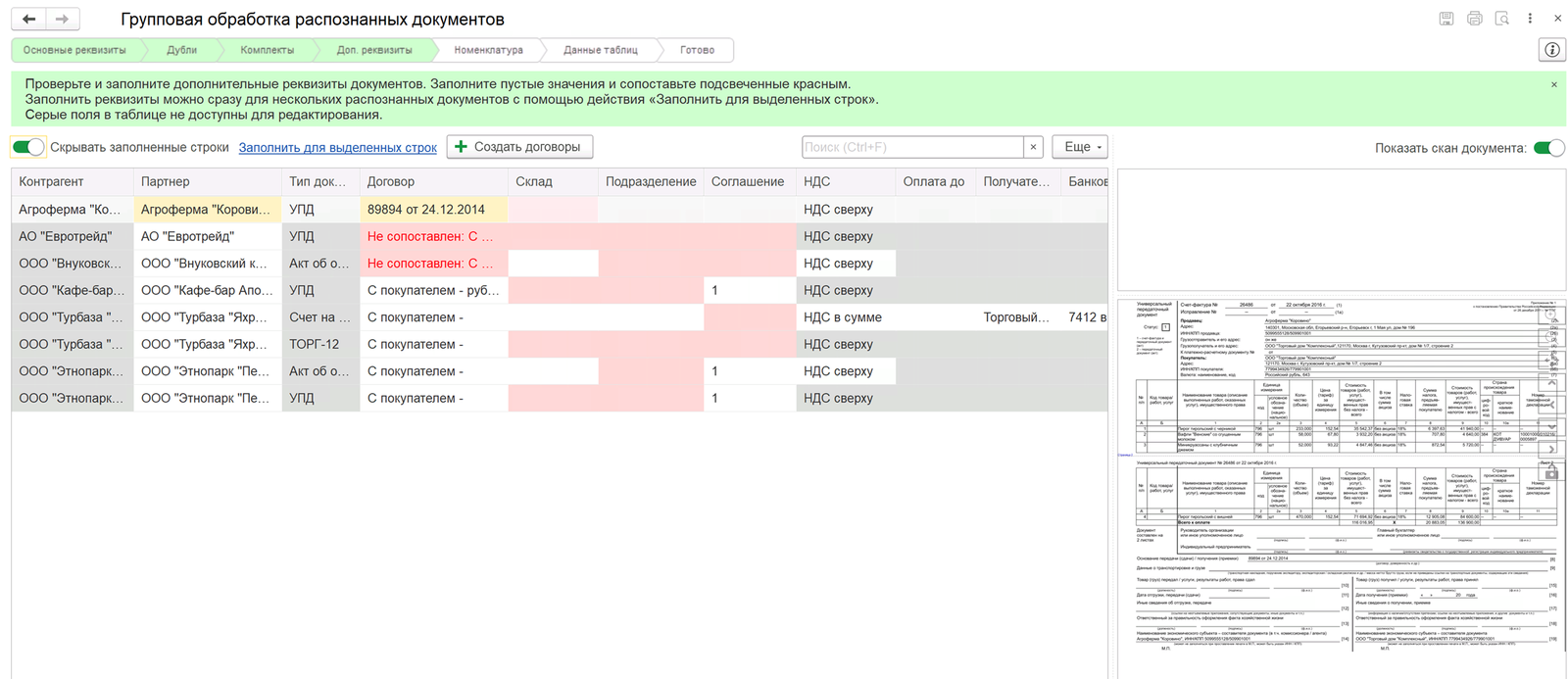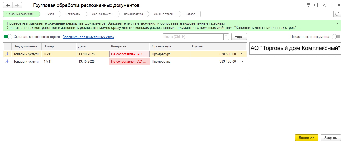 На этапе Данные таблиц производится проверка и в случае необходимости уточнение значений реквизитов из таблиц распознанных документов.