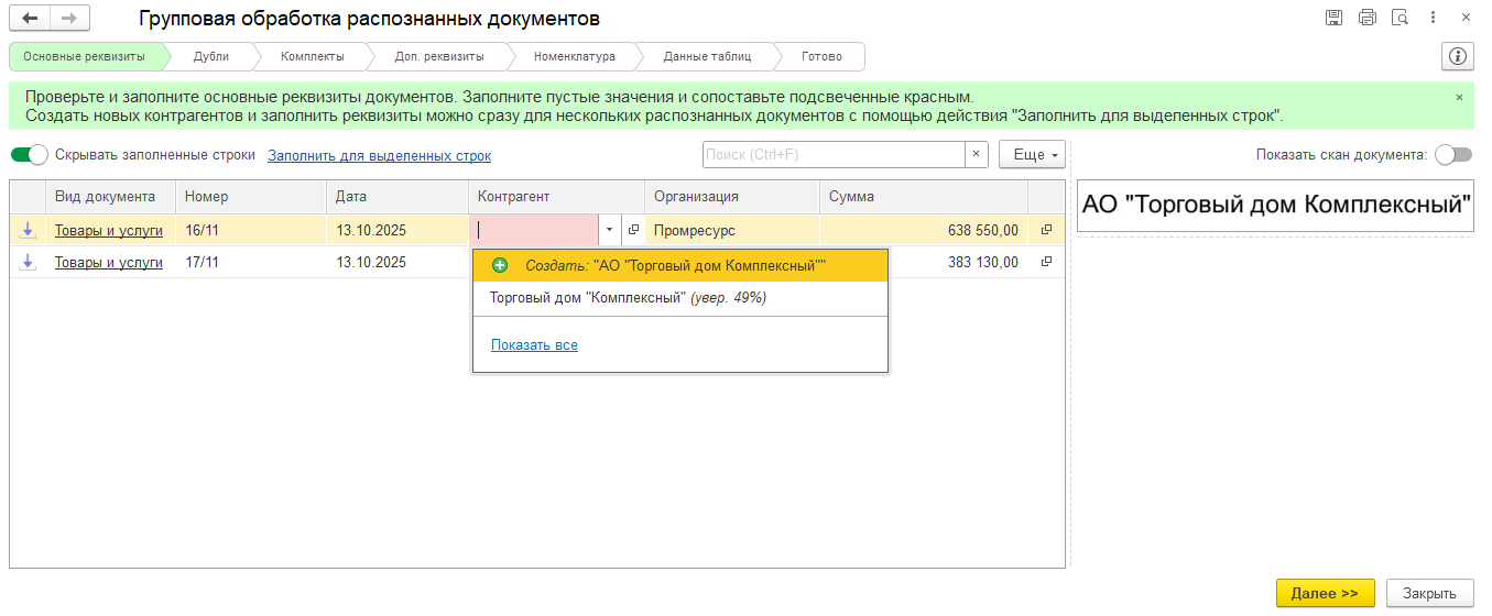 Редактирование основных реквизитов производится в таблице. В списке доступны команды создания нового элемента согласно распознанному названию, а также варианты существующих элементов справочника, которые с определенной степенью уверенности могут подойти.
