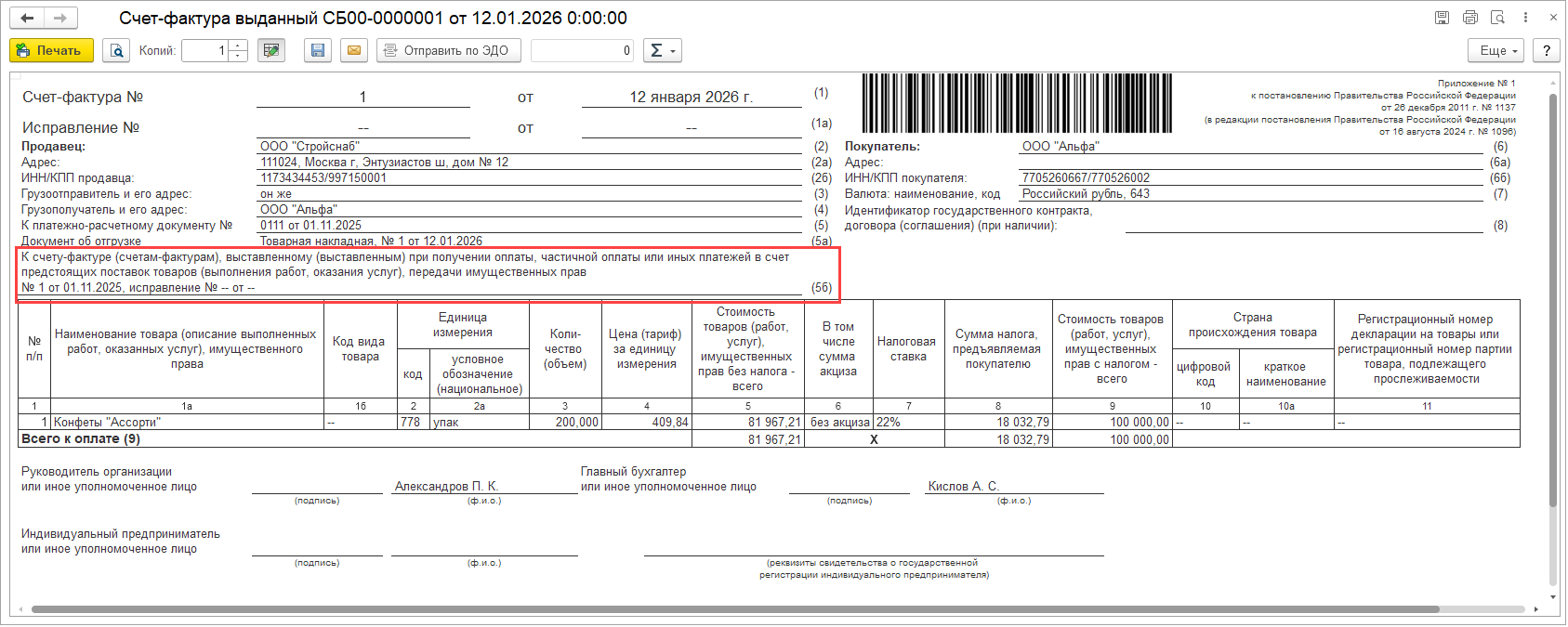 Если в информационной базе включена функциональная опция Использовать печатные формы счета-фактуры, УПД и УКД версии 2.5 (меню НСИ и администрирование – Настройка НСИ и разделов – Учет НДС, импорт и экспорт – Учет НДС), в печатной форме счета-фактуры (УПД) выводится и заполняется новая строка 5б «К счету-фактуре (счетам-фактурам), выставленному (выставленным) при получении оплаты, частичной оплаты или иных платежей в счет предстоящих поставок товаров (выполнения работ, оказания услуг), передачи имущественных прав №________от________, исправление №________от________». Строка 5б содержит данные выставленных счетов-фактур на авансы (с учетом актуальных исправлений).