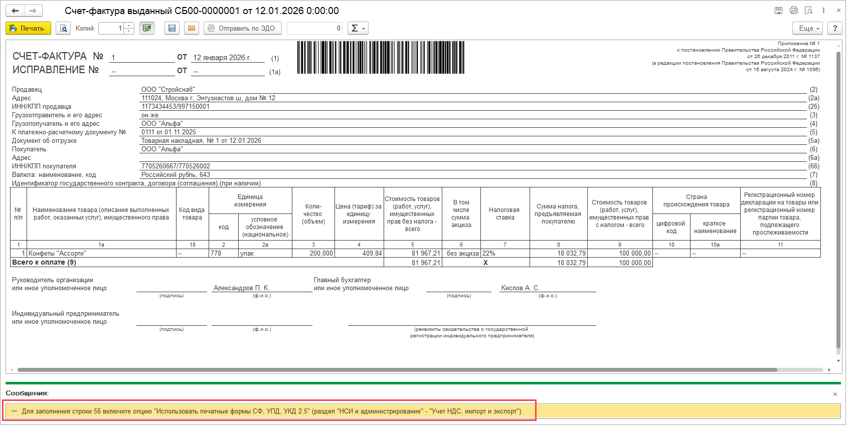 Если в информационной базе выключена функциональная опция Использовать печатные формы счета-фактуры, УПД и УКД версии 2.5, в печатной форме счета-фактуры (УПД) строка 5б отсутствует. Выводится соответствующее предупреждение.