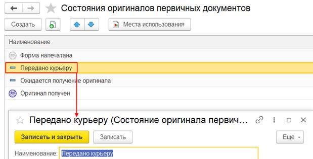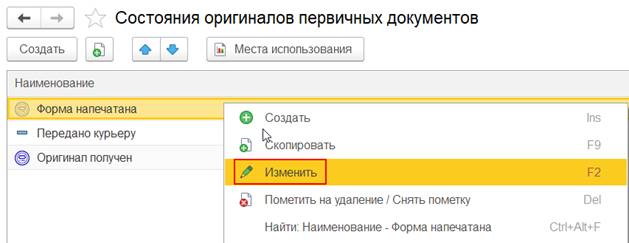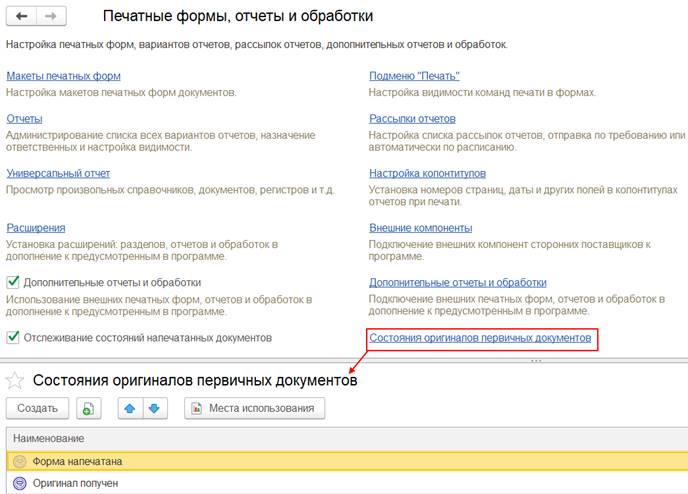 Предопределенные состояния оригиналов первичных документов хранятся в справочнике НСИ и администрирование – Администрирование – Печатные формы, отчеты и обработки – Состояния оригиналов первичных документов.