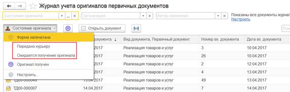 Также перейти к настройке состояний оригиналов можно из журнала учета оригиналов первичных документов (команда Настроить).