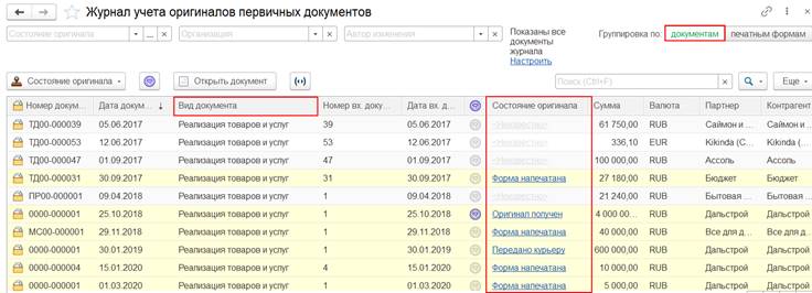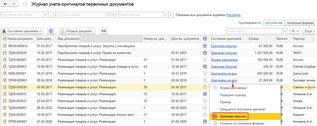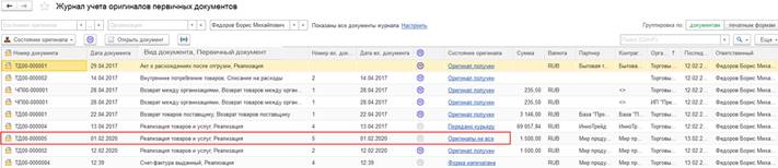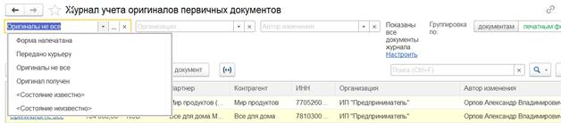 Вести учет наличия оригиналов первичных документов, контролировать состояния оригиналов первичных документов по общему состоянию документа можно в рамках журналов документов (например, в рамках журналов Документы продажи (все), Документы закупки (все)). Для такой возможности в журналы документов добавлены соответствующие инструменты: