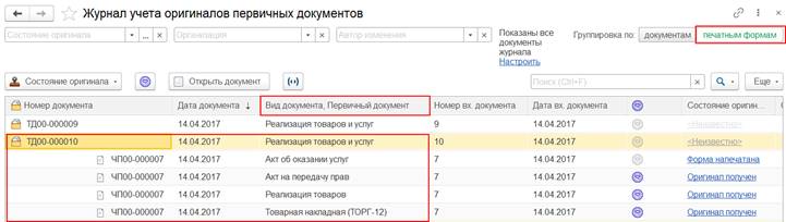 Общее состояние оригинала (или печатных форм) первичного документа реализации товаров и услуг можно просмотреть при группировке по печатным формам.