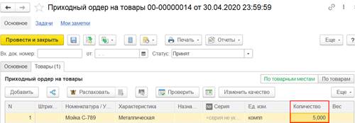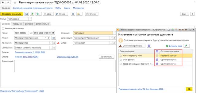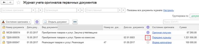 Также состояние оригинала первичного документа отображается непосредственно на форме документа реализации товаров и услуг.