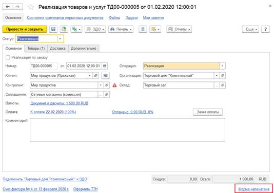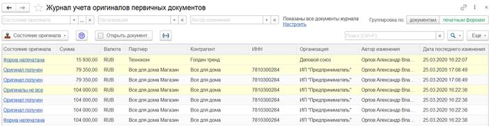 В журнале учета оригиналов первичных документов (в режиме группировки по печатным формам) для документа реализации и каждой его печатной формы можно увидеть текущее состояние оригинала Форма напечатана.