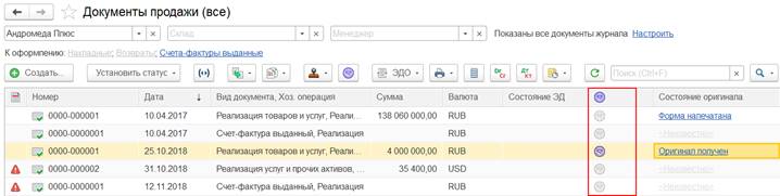 Также проконтролировать состояние оригинала первичного документа можно по общему состоянию документа Реализация товаров и услуг в рамках журнала документов продажи.