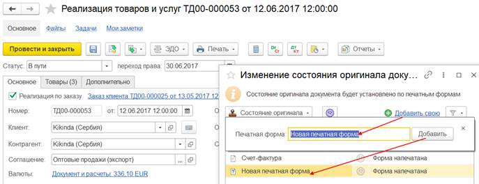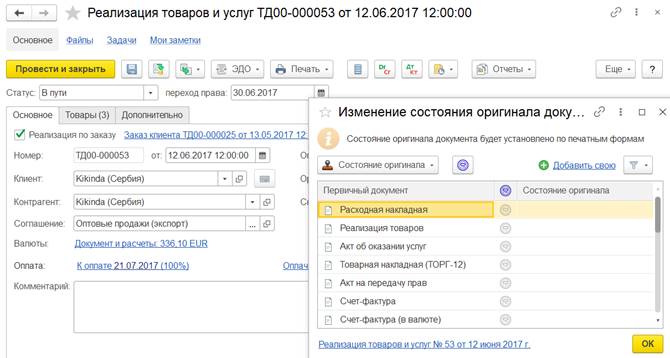 Как только для каждой печатной формы будет установлено состояние Оригинал получен, то документ реализации товаров и услуг примет по умолчанию окончательное состояние Оригинал получен.
