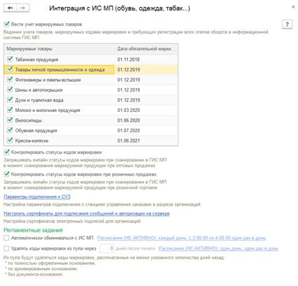 Для интеграции с ИС МП для учета обувной продукции необходимо установить флажок НСИ и администрирование – Администрирование – Интеграция с ИС МП – Вести учет маркируемых товаров. В списке указываются конкретные категории товаров, с которыми работает организация. Напротив каждой товарной категории указывается дата, начиная с которой маркировка товаров этой категории становится обязательной. До дата начала обязательной маркировки по соответствующей категории товаров в продаже может находиться немаркированная продукция вместе с маркированной. До этого момента возможно продажа без указания кодов маркировки.