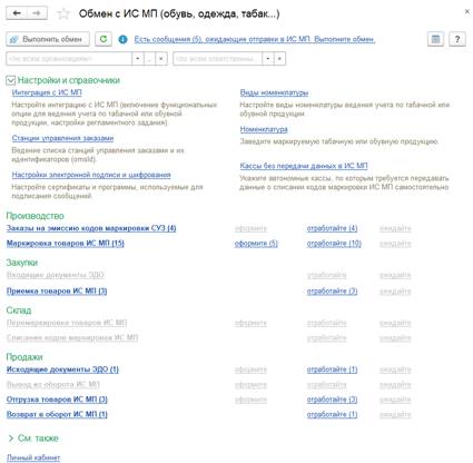 Форма Обмен с ИС МП (обувь, одежда, табак..) является единым рабочим местом, из которого можно выполнять настройки обмена с ИС МП оформлять и контролировать все операции по всем категориям маркируемой продукцией.