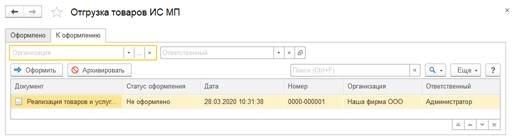 По этой ссылке открывается список документов к оформлению. Создать документ Отгрузка товаров ИС МП для указанного документа Реализации товаров и услуг можно по кнопке Оформить.