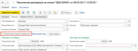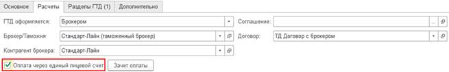 Для возможности оплаты через единый лицевой счет на форму документа Таможенная декларация на импорт добавляется реквизит Оплата через единый лицевой счет.