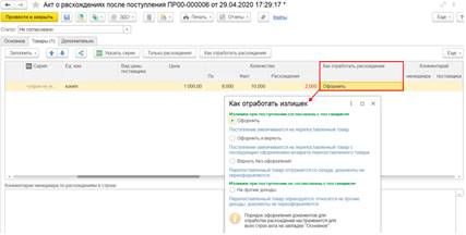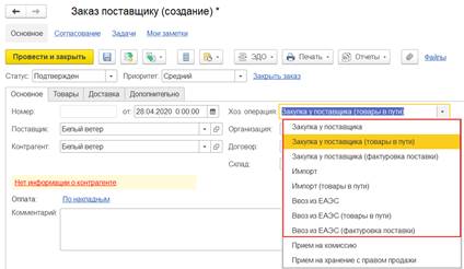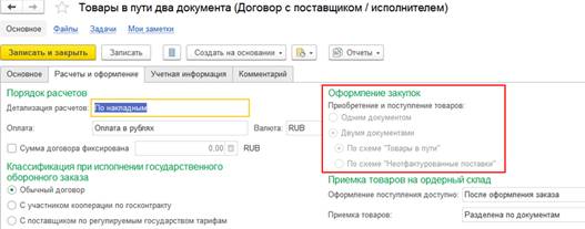 При таких настройках в заказах и накладных на выбор будут доступны операции как для оформления закупок одним документом, так и для оформления закупок двумя документами. Доступность выбора операций по схемам «Товары в пути» или «Неотфактурованные поставки» зависит от настройки в договоре.