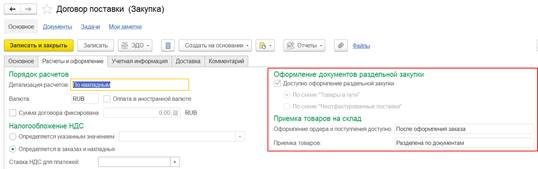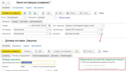 Теперь за счет настройки Оформление документов раздельной закупки поддерживается возможность в рамках одного договора с поставщиком оформлять как закупки одним документом, так и раздельные закупки двумя документами: