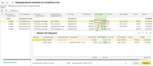 Если с поставщиком зарегистрирован договор на оформление закупок одним документом, то для оформления раздельной закупки двумя документами требовалась регистрация нового отдельного договора с поставщиком. Поскольку в рамках одного договора можно было оформлять либо закупки одним документом, либо закупки двумя документами. Такая возможность обеспечивалась за счет настройки Оформление закупок в договоре с поставщиком.