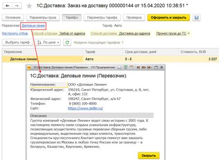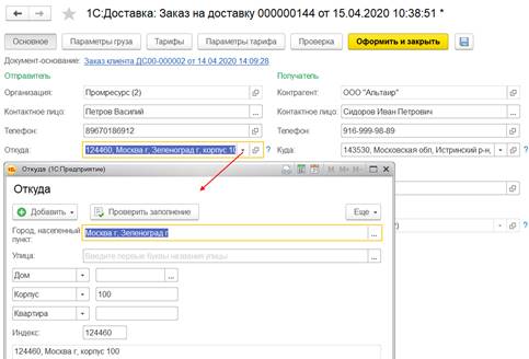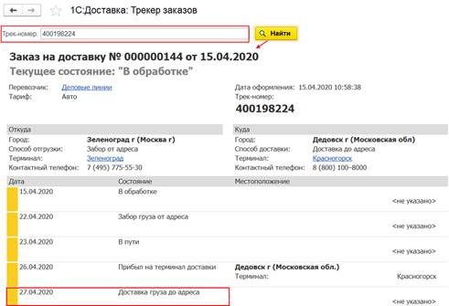 Автоматически будет найден заказ на доставку и откроется форма заказа с детальной информацией по его состоянию. На форме заказа отображаются плановые даты по будущим состояниям (например, «Доставка груза до адреса» планируется на дату 27.04.2020).