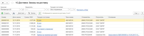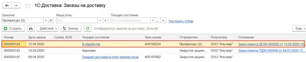 Отслеживать текущее состояние заказа на доставку и местоположение груза можно по трек номеру заказа с использованием специализированной формы 1С:Доставка:Трекер заказов, которая доступна: