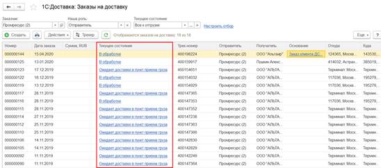 По результату применения отбора по текущему состоянию «Все к отгрузке» будут отобраны заказы на доставку, которым соответствуют состояния «В обработке», «Забор груза от адреса».