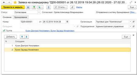 Заявка может быть оформлена сразу на группу сотрудников, направляющихся в командировку. Для этого предусмотрен флаг Группа сотрудников на закладке Основное и указать список сотрудников: