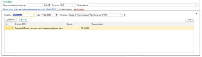 В документе можно указать планируемые выплаты ДС на командировочные расходы в отдельной табличной части: