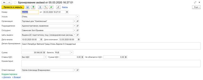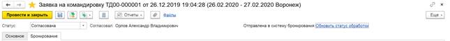 Документы бронирований будут загружены в систему, ссылки на них можно будет найти в документе заявки на командировку на закладке Бронирование в нижней части документа.