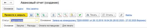 Авансовый отчет теперь может быть создан на основании документа Заявка на командировку. Заявка будет указана в шапке авансового отчета как документ-основание.