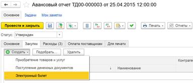Оформление нового документа Электронный билет, приобретенного через подотчетное лицо выполняется на закладке Закупки с использованием конмады Создать – Электронный билет: