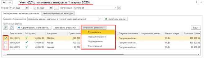 С целью повышения удобства формирования счетов-фактур на аванс в рабочем месте Учет НДС с полученных авансов добавлена графа выбора документов, для которых необходимо выполнить операцию. Установить/снять флажок