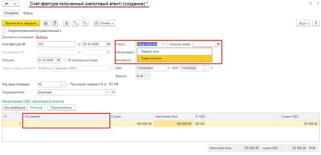 По результатам оформления документа Счет-фактура полученный (налоговый агент) начисление НДС выполняется на дату отгрузки товаров, т.е. на дату составления документа, вычет НДС – на дату, указанную в поле переход права.