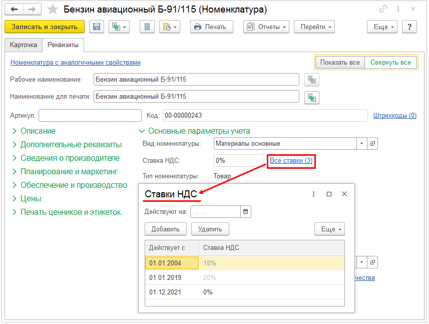 Хранение ставок НДС для номенклатуры организовано в новом регистре сведений Ставки НДС номенклатуры. В карточку элемента списка Номенклатура добавлена гиперссылка Все ставки, по которой выполняется переход в указанный регистр.