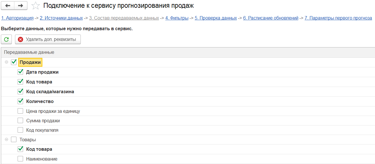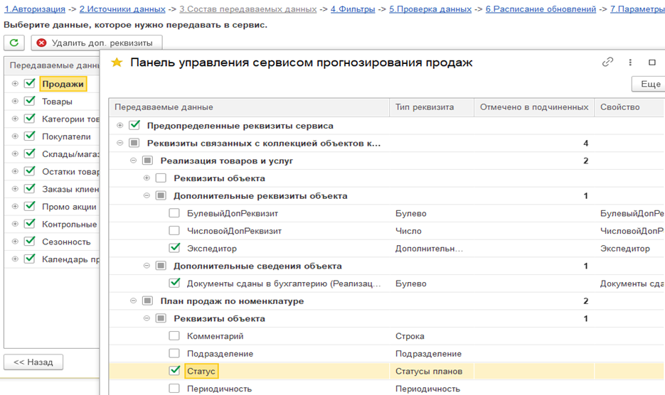 На этом этапе необходимо выбрать данные, которые нужно передавать в сервис - выбираются коллекции, обязательные и специальные поля для выгрузки в сервис прогнозирования продаж. Внутри каждой коллекции так же можно выбрать состав передаваемых полей.
