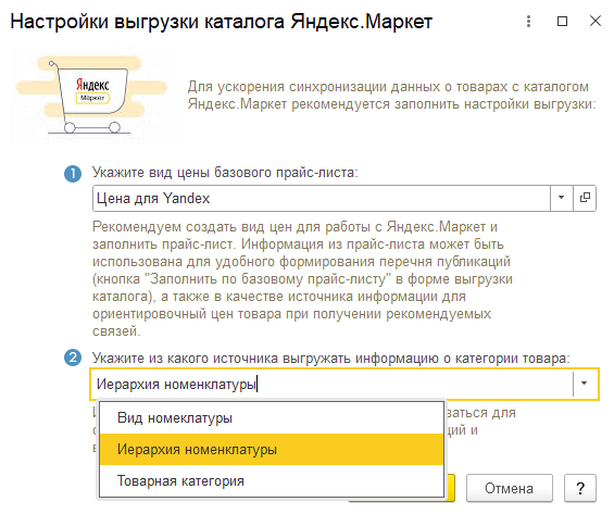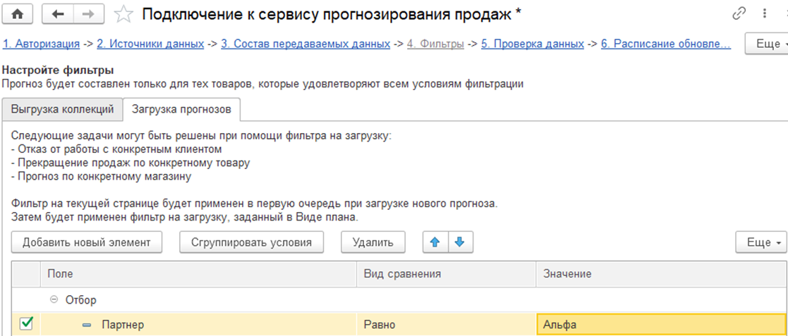 На этом этапе можно задать фильтры, ограничивающие выгрузку по товарам, партнерам и складам. В сервис будут передаваться данные только о тех товарах, которые удовлетворяют всем условиям фильтрации. Отбор на базе СКД позволяет управлять выгрузкой данных.