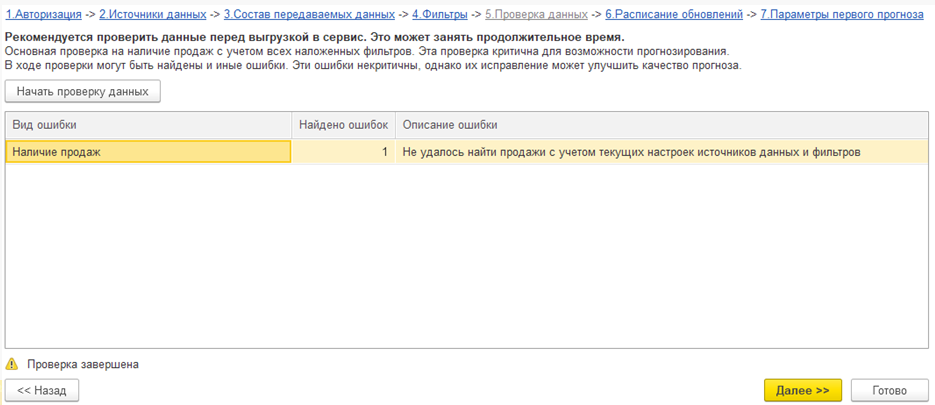 При проверке наличия продаж учитываются настройки источников данных и фильтров. Если обнаружена ошибка наличия продаж, ее требуется исправить. Иначе сервис не сможет работать.