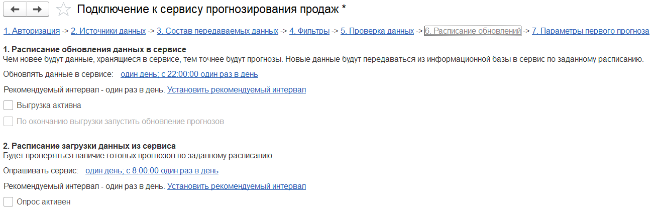 Можно настроить расписание выгрузки данных в сервис (по умолчанию раз в день) и расписание опроса о наличие новых результатов прогнозирования в сервисе (по умолчанию раз в пять минут).