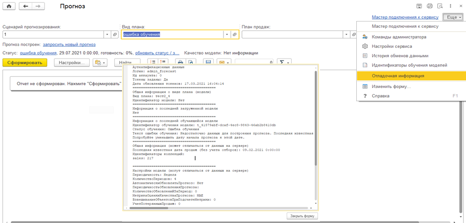Когда сценарий прогнозирования и вид плана созданы, можно запросить прогноз (гиперссылка Запросить прогноз). Некоторое время (обычно часы) прогноз будет рассчитываться.