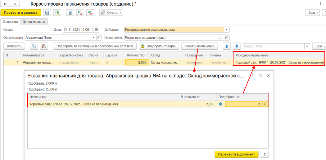 При резервировании в заголовке обработки по заполнению корректировки назначения отображается назначение-получатель, под которое необходимо обособить товары на складе.