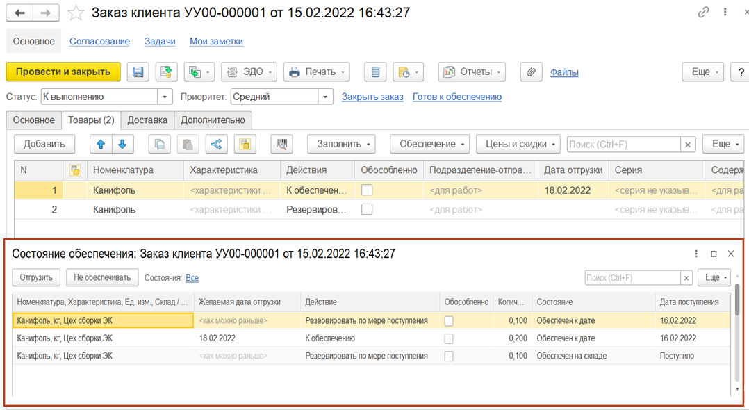 При этом действие «К обеспечению» позволяет зафиксировать потребности в заказах без автоматического резервирования товаров на складе.