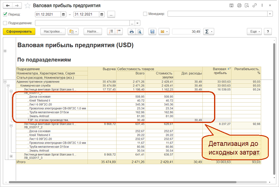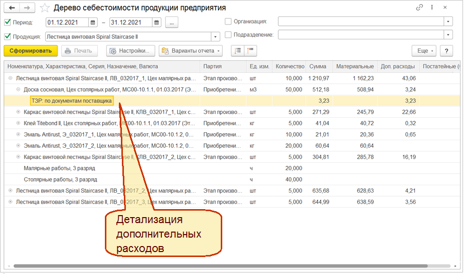 Детализация до исходных затрат в отчетах будет видна только в периодах, рассчитанных с новым механизмам детализации себестоимости. В отчетах поддержан выбор полей для расшифровки детализации себестоимости до исходных затрат.