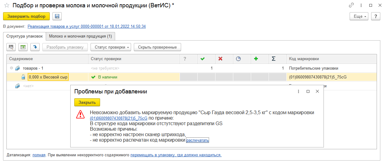 В ряде случаев альтернативой перемаркировки может быть печать дубликата кода. В частности, при включенной опции НСИ и администрирование – Администрирование – Интеграция с ИС МП (обувь, одежда, табак…) – Настройки сканирования кодов маркировки – Проверять структуру кодов маркировки, если в форме Подбор и проверка маркируемой продукции кода отсканирован код, в котором отсутствуют служебные символы GS, предлагается метод исправления проблемы – распечатать код.